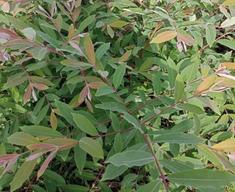 - Lá: Mọc đối xứng, hình mác, dài 12-13cm, rộng 3.5-4cm. Gân chính màu đỏ, lá non gân và phiến lá có màu đỏ đậm.
