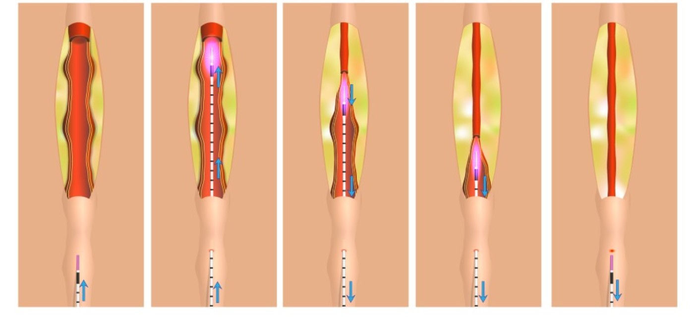 Khi sợi laser được đưa vào bên trong mạch máu, nguồn năng lượng sẽ phát ra nhiệt. Nhiệt này làm thành mạch co lại, xơ hóa và đóng kín vĩnh viễn, không cho máu tiếp tục ứ đọng trong đoạn tĩnh mạch bị giãn. Máu sẽ được dẫn lưu qua các tĩnh mạch khỏe mạnh khác, nhờ đó giảm triệu chứng đau, sưng, nặng chân và cải thiện hình dạng bên ngoài.