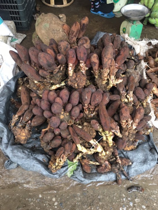 - Phần hoa (nón): Phần này nhô lên khỏi mặt đất, có hình dạng giống bắp ngô hoặc hình trụ, thường dài khoảng 10-15 cm. Khi còn non, hoa có màu trắng hoặc vàng nhạt, được bao bọc bởi một lớp lá bắc màu tím sẫm hoặc nâu đỏ. Khi nấm trưởng thành, lớp lá bắc này sẽ bung ra, để lộ phần thân nấm bên trong có màu trắng ngà với các nốt sần nhỏ, trông hơi giống búp sen.